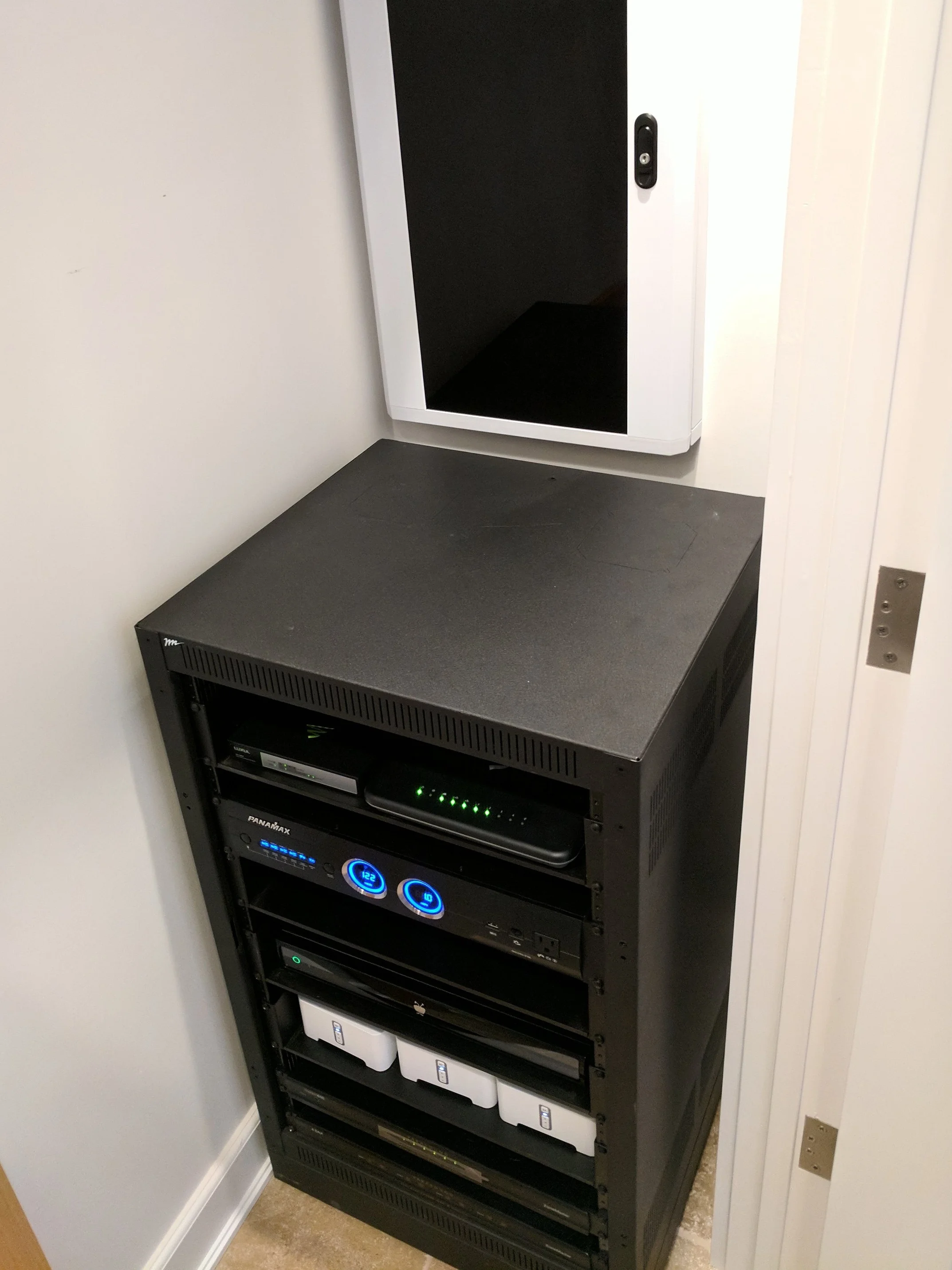 This whole home control rack & in-wall rack for this Des Moines home controls audio, TVs, and network access throughout. Whole home audio powered by Sonos.